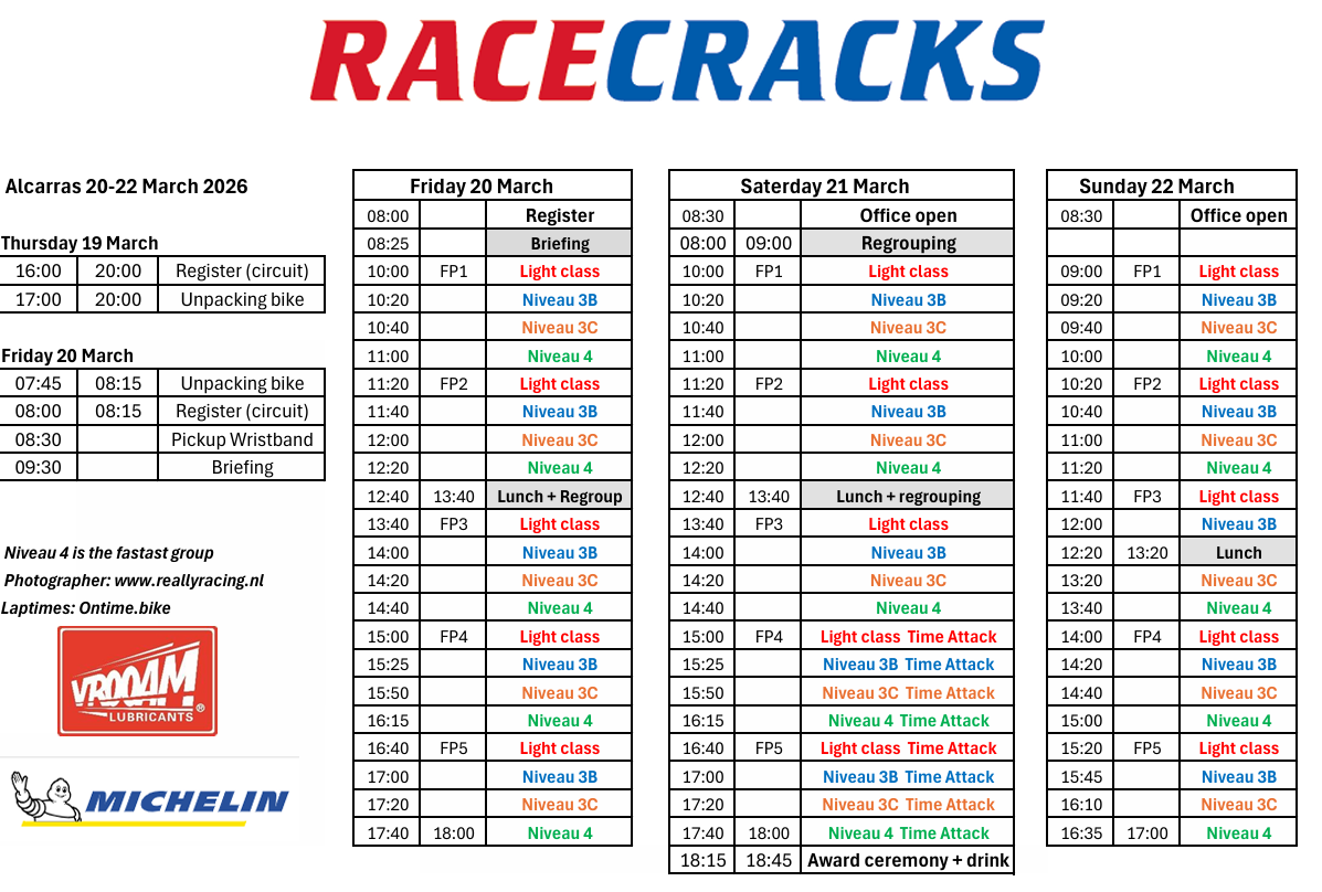 Groepsindeling: Aparte groep voor lichte motoren en vrij rijden groepen ingedeeld op rondetijden
